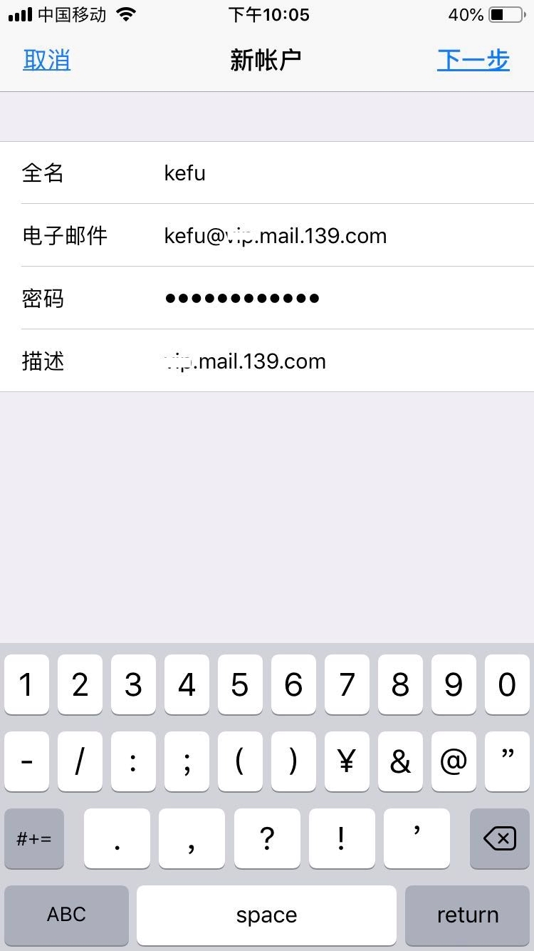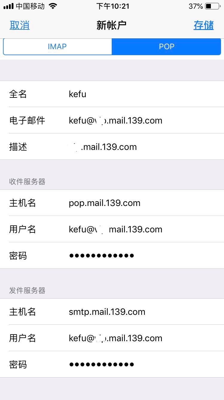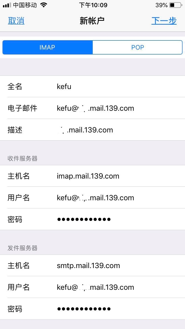 接收邮件服务器:imap.mail.139.com;